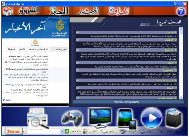 برنامج تصفح الجرائد 2010 برنامج تصفح الجرائد الجديد بمميزات رائعة وبساطة في الإستعمال ملاحظة : البرنامج يعمل في حالة الإتصال بالشبكة فقط وهو مجاني الواجهة الرئيسية للبرنامج وتحتوي على بلوك يحتوي على روابط للصحف العربية ، وبلوك لآخر الأخبار من الجزيرة نت اصور في المرفقات التحميل setup-journal-algeria.exe
