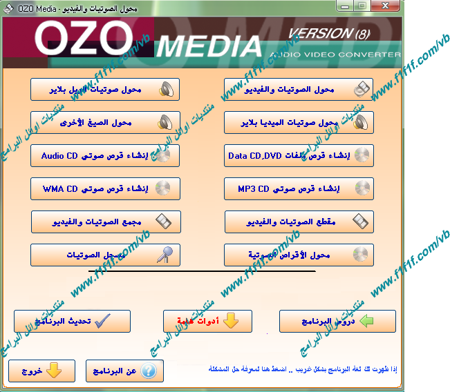 الإصدار 8 من برنامج محول الصوتيات والفيديو بالعديد من التحسينات والمميزات الجديدة الإضافات الجديدهـ التي تم اضافتها في هذا الإصدار تريح الكثير من عناء البحث عن برامج تحويل وتقطيع وتسجيل الصوتيات والفيديوهات .. ![]() ![]() الجديد في الإصدار 8 1. تم تطوير خاصية تحويل الصوتيات والفيديو بشكل كامل كليا ويتميز عن الإصدار القديم ب : السرعة العالية في التحويل : حيث يعتبر البرنامج الآن من أسرع برامج الصوت والفيديو في التحويل يدعم صيغ صوت وفيديو جديدة ، البرنامج يدعم الصيغ التالية : AVI, MPG, MPEG, WMV, MP4, M4V, ASF, MOV, QT, 3GP, DAT, OGM, RM, RMVB, RAM, RA, FLV, WAV, MP3, WMA, OGG, APE, M4A, MPC, WV, AMR, AC3, AU, M4A تم حل بعض المشاكل في التعامل مع بعض الصيغ الموجودة في الإصدارات السابقة. 2. تم تطوير برنامج النسخ بشكل كامل وحل جميع مشاكل النسخ الموجودة في الإصدارات السابقة بشكل نهائي كما أصبح البرنامج يتعامل مع جميع أنواع وسائط التخزين المختلفة مثل : BD-R / BD-RE (Blu-Ray) DVD+R Dual Layer DVD-R Dual Layer DVD+R / DVD+RW DVD-R / DVD-RW DVD-RAM CDR / CDRW كما تم أيضا تطوير خاصية إنشاء الأقراص الصوتية وحل جميع مشاكل الإصدارات السابقة كما يدعم برنامج النسخ الجديد نسخ ملفات ISO وإنشاءها. 3. تم إضافة خاصية تقطيع ملفات الصوت والفيديو تمكنك من أخذ جزء معين من أي مقطع ، ويدعم جميع أنواع صيغ الصوت والفيديو المذكورة أعلاه. 4. تم إضافة خاصية تجميع ملفات الصوت والفيديو تمكنك من تجميع عدة ملفات صوت أو فيديو في ملف واحد ، ويدعم جميع أنواع صيغ الصوت والفيديو المذكورة أعلاه. 5. تم حل جميع مشاكل تسجيل البرنامج وإلغاء محدودية التسجيل بعدد 3 مرات بحيث أصبحت بعدد غير محدد من المرات. والعديد من المزايا الأخرى شاهد التحسينات والاضافات الجديدة من الصورة التالية : ![]() ![]() لــلــتــحــمــيــل مـــن هــنــا http://ia360931.us.archive.org/0/ite...o_600/ozoo. rar أوhttp://zoqq0a.blu.livefilestore.com/...f.zip?downl oad أو http://www.zshare.net/download/658489869479a4/ او http://www.2shared.com/file/3116426/150bef18/__8.h tml او http://www.zshare.net/download/103478784fad2c4c/ او http://uploaded.to/?id=g6yurj أو http://depositfiles.com/en/files/4663270 او http://www.mddes.com/m15/ozomedia8ByMaX.rar متوافق مع ويندوز XP & Vista.. بالصور طريقة تركيب الكراك وتفعيل البرنامج : ![]() ![]() ![]() ![]() ![]() بيانات التسجيل NAME : HUMAID AL GHAITHI CITY : BURAIMI COUNTRY : OMAN aaa@aaa.com:EMAIL الكراك من هنا http://abufahad6.jeeran.com/record%20Crack.exe أو http://rapidshare.com/files/106048065/record_Crack .exe منقول للفائدة
