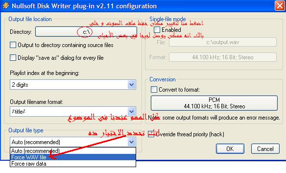 الحين لازم تختار Force wav file من بند Output file type ويستحتسن تغير مكان حفظ الملف من فوق مثل ما أنت شايف فى الصورة اللى تحت