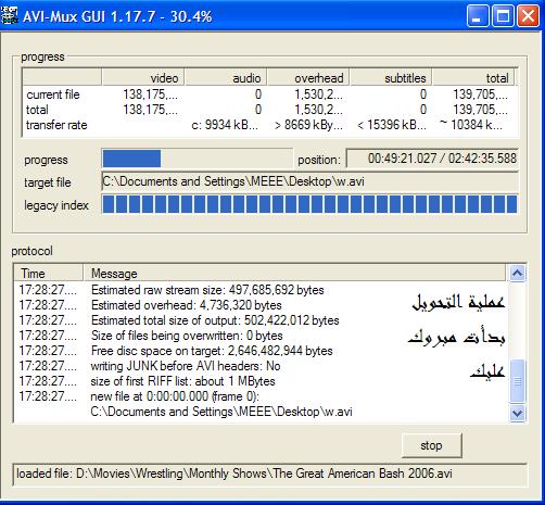 انتهت المرحلة الثانية من عملية التحويل نبدأ في شرح المرحلة الأخيرة و هي دمج ملف الصوت مع ملف الصورة اذا ماقدرت برنامج NSV Demuxer في عمل كذا لأنى بصراحة حولت 5 ملفات باستخدام البرنامج لكن للأسف مافيه غير واحد بس اللى قدر يندمج مع الصورة بعد ما حولت ملف الصوت من wav الى mp3 لكن عمية التحويل ماهي ضرورية اذا كنت تستخدم البرنامج الثالت و هو AVI MUX GUI و أنا لاحظت انه أسهل برنامج في العملية هذي بس جايز تقابلك نفس المشكلة اللى أنا لمحت عنها و هى عدم تحويل الملف كامل لأن ملف الفيديو ناقص و تلاقي الحل بعد الشرح.